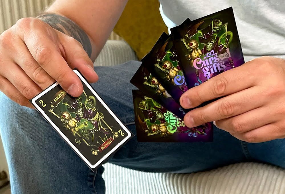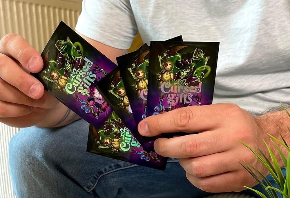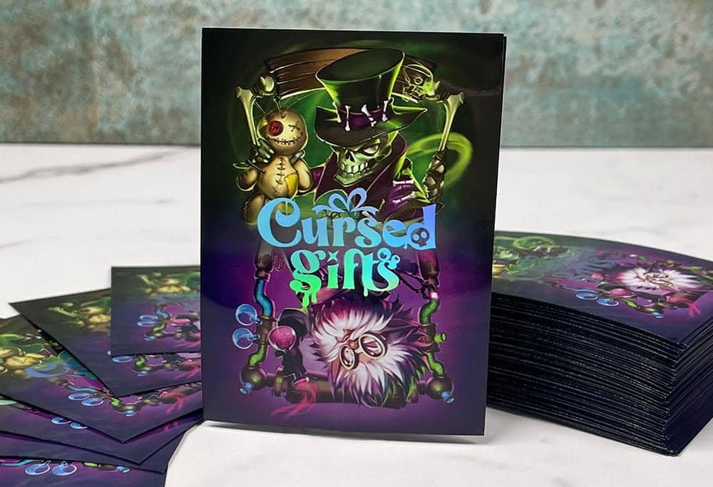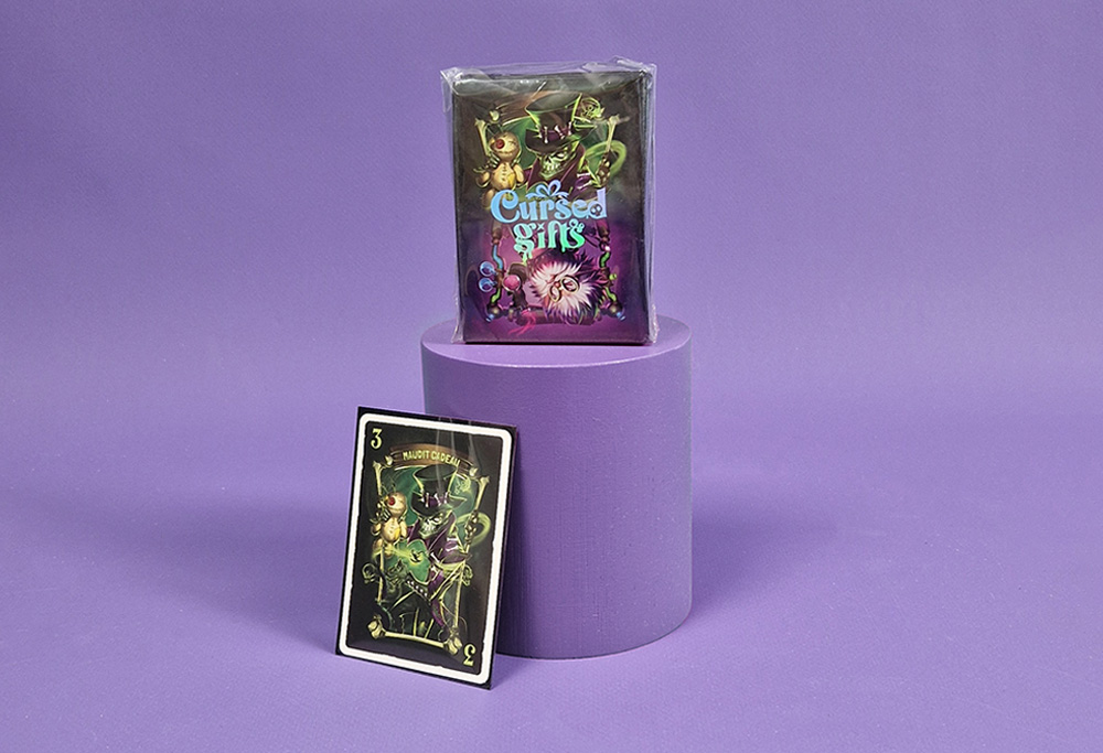 Buste protettive gioco di carte con logo "Cursed Gifts" lucido olografico. Proteggeranno le tue carte Maledetti Regali. Le loro dimensioni sono standard e possono contenere carte di dimensione 63x88mm.