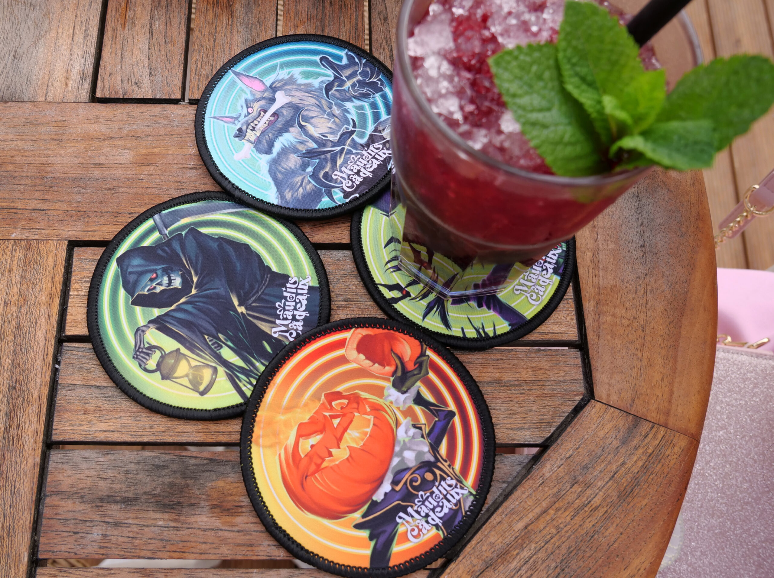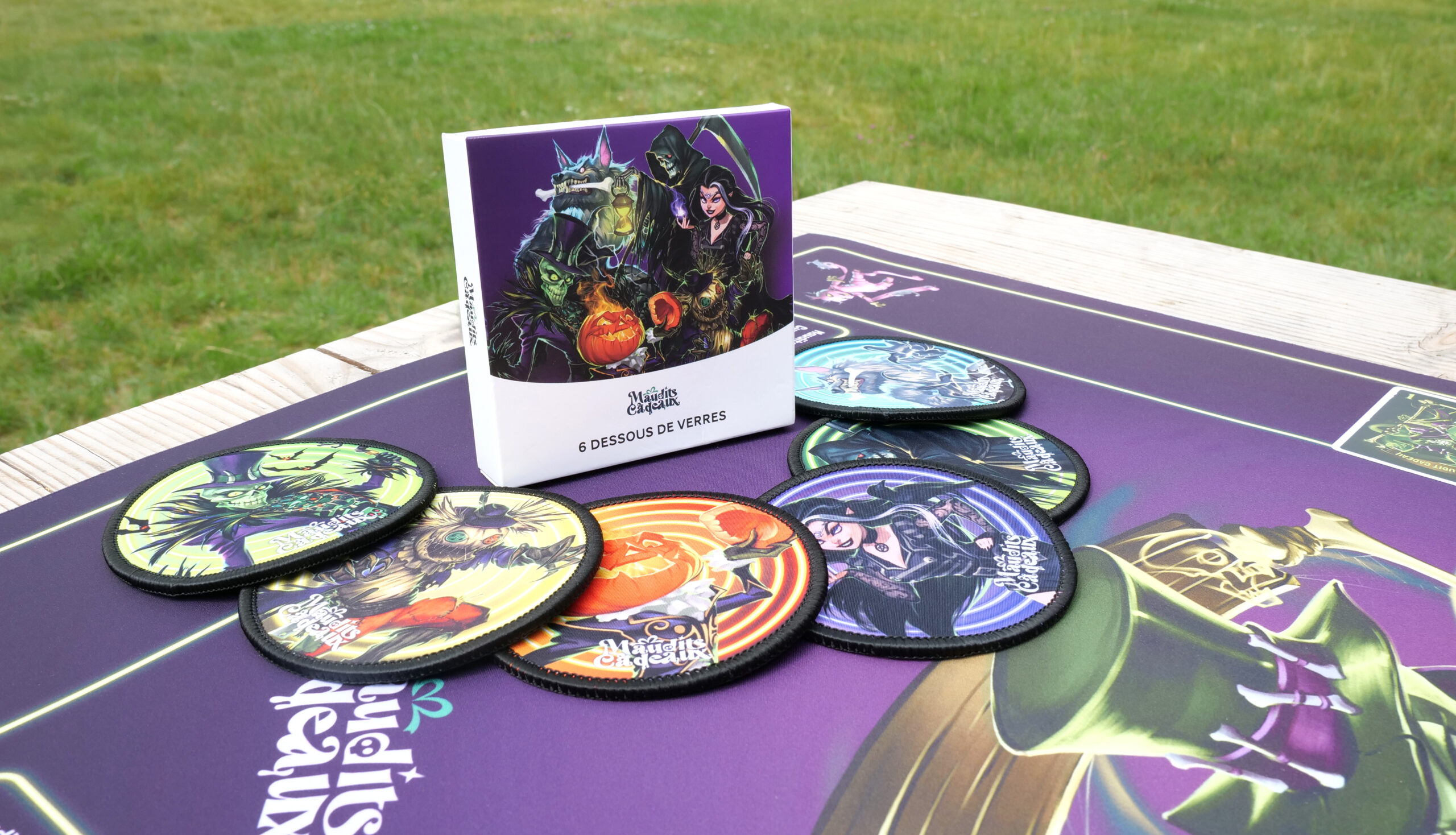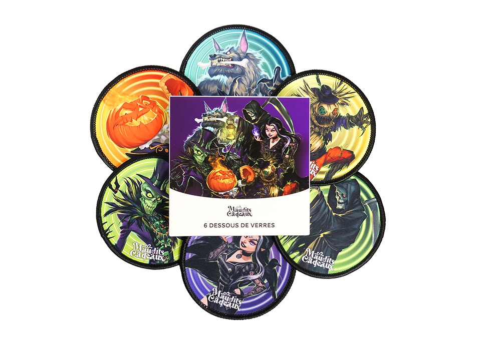 Set di 6 sottobicchieri in neoprene raffiguranti 6 personaggi emblematici del gioco di carte Maledetti Regali.